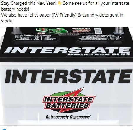 We Also carry Interstate Batteries, toilet paper, Bagged Ice, & various outside light replacements.